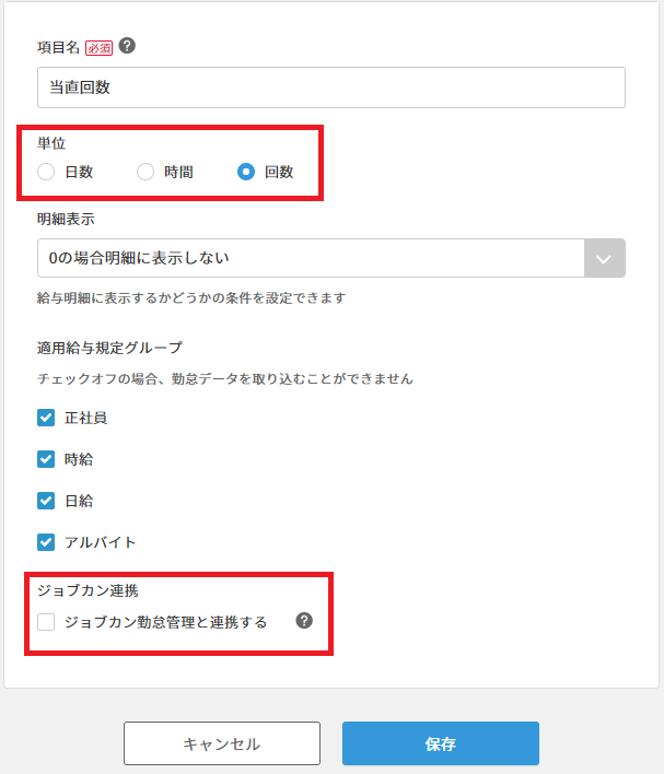 ※単位を「回数」とし、ジョブカン連携項目ではないため、チェックは入れないでください。