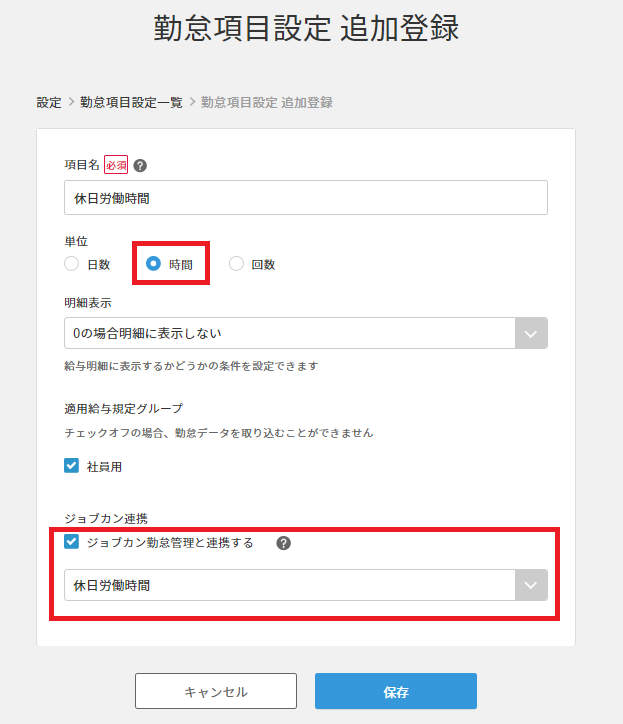 ・ジョブカン勤怠管理と連携する:チェックを入れて「休日労働時間」を選択します。