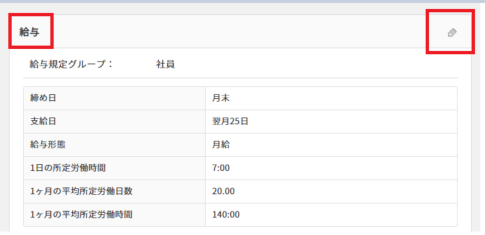3. 「従業員一覧」→対象従業員の名前を選択して従業員詳細画面を開き、「給与」欄の編集アイコンを選択します。